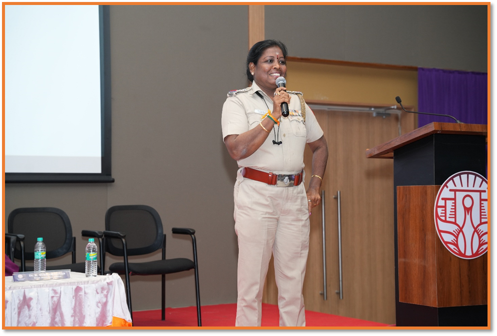 The keynote address was delivered by Ms. J. Kirubalakshmi, Inspector of Police, All Women Police Station, Tindivanam. She expressed her pleasure in being part of the event and shared valuable insights on the real-life challenges faced by women in society today. Drawing from her professional experience, she discussed the importance of awareness, confidence, and support systems for women in dealing with such issues.
